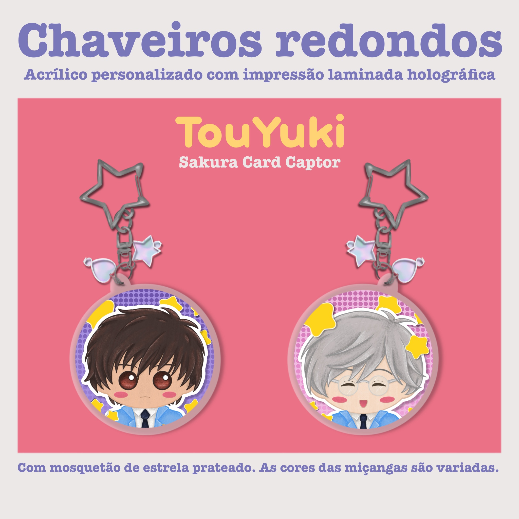 O chaveiros possuem arte impressa nos dois lados iguais ou diferentes, de acordo com a foto de cada produto, com laminação holográfica.